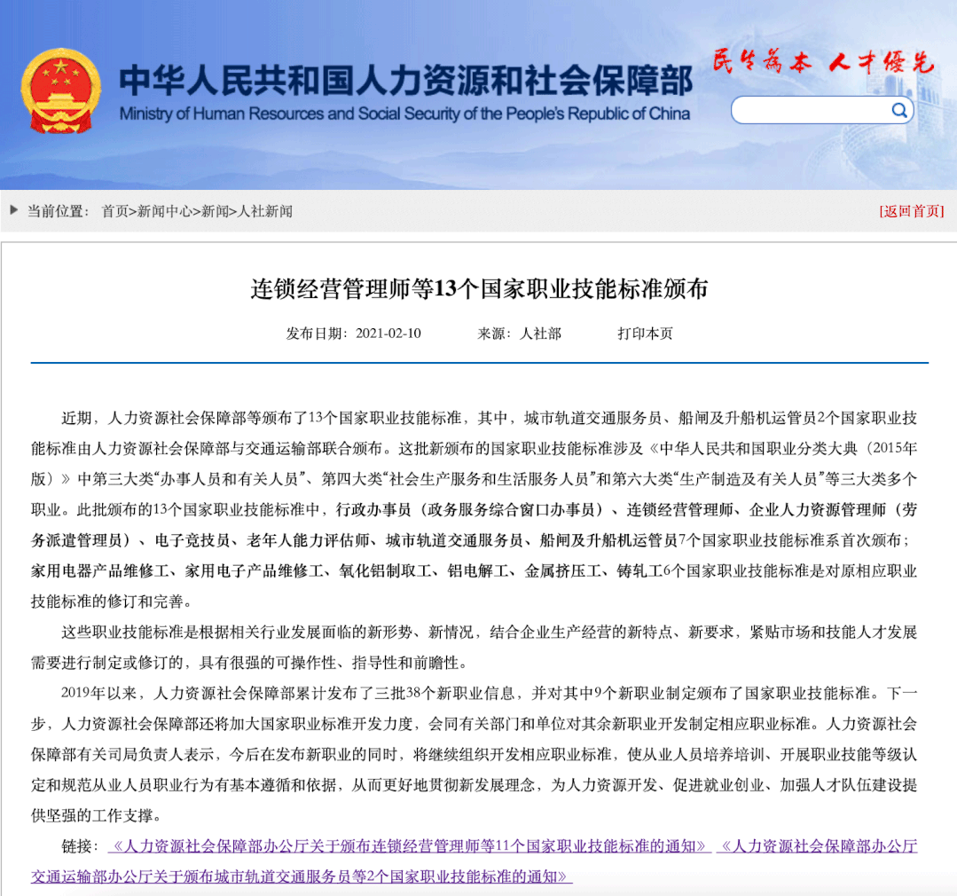 2021年2月10日,人社部發(fā)文“連鎖經(jīng)營管理師等13個國家職業(yè)技能標準頒布”,其中首次頒布了《行政辦事員(政務服務綜合窗口辦事員)》的國家職業(yè)技能標準。