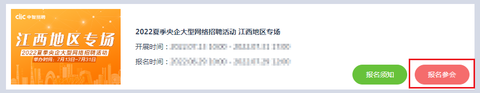 完成職位發(fā)布后,請(qǐng)繼續(xù)在雇主端進(jìn)入“活動(dòng)報(bào)名管理-網(wǎng)絡(luò)招聘會(huì)報(bào)名”,選擇江西地區(qū)專場(chǎng),點(diǎn)擊“報(bào)名參會(huì)”后進(jìn)行職位準(zhǔn)入。