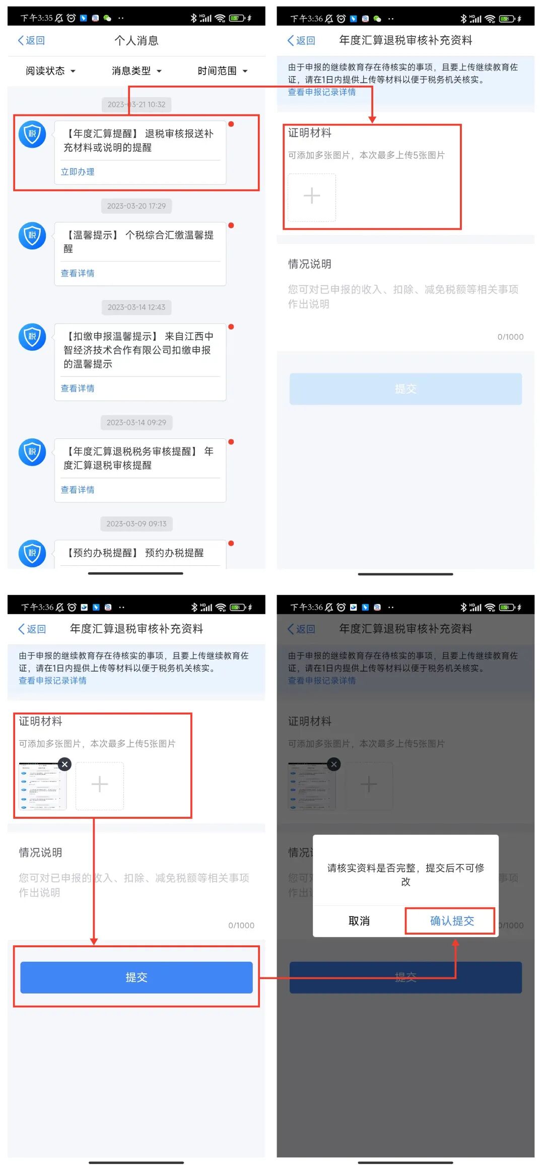 納稅人收到稅局發(fā)送的“退稅審核報(bào)送補(bǔ)充材料或說明的提醒”信息后需補(bǔ)充相關(guān)佐證資料