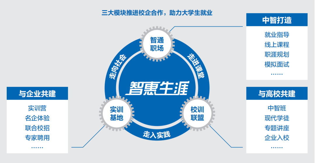 “中智智惠生涯”,通過“走進課堂”“走入實踐”“走向社會”的三步走培養(yǎng)模式,攜手校、企共同打出促就業(yè)組合拳。通過溝通,將求職者與用人單位引薦到一起,讓雙方的需求高效結合,解決學歷教育與實際就業(yè)之間的問題,為當前廣泛存在的人才供需矛盾提供實用解法。