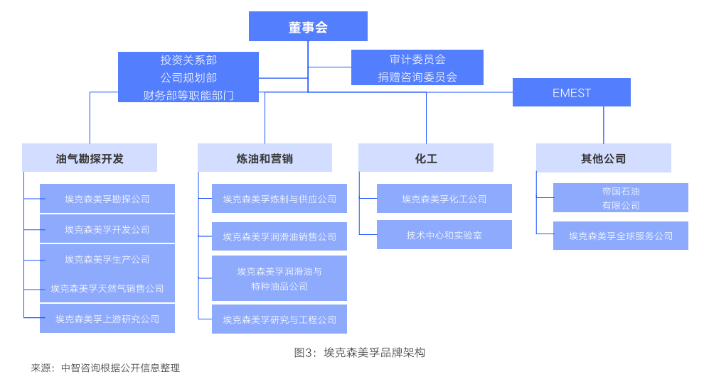 埃克森美孚采用“企業(yè)品牌+事業(yè)品牌+產(chǎn)品或服務(wù)品牌”復(fù)合式的品牌架構(gòu)模式。第一層級為企業(yè)品牌??松梨冢诙蛹壥聵I(yè)品牌包括??松梨诨?、加拿大帝國石油等事業(yè)品牌,第三層級為產(chǎn)品品牌,以潤滑油產(chǎn)品為例,??松梨诖蛟斐鯡xxon、Mobil和Esso三大知名潤滑油品牌。