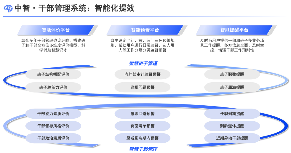 中智打造現(xiàn)代化干部管理體系,數(shù)字化賦能干部管理價(jià)值重塑,銜接一體化干部隊(duì)伍管理策略,精細(xì)化落地干部管理全流程,建立常態(tài)化管理機(jī)制,夯實(shí)管理基礎(chǔ),提升管理效能。
