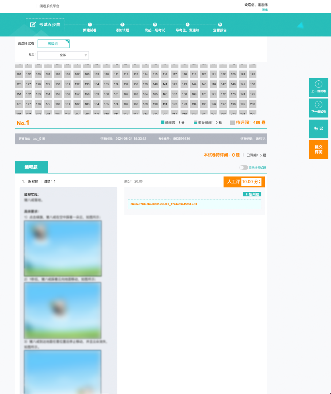 賽碼閱卷管理平臺提供多種靈活閱卷方式,如按套或者按題閱卷、封閉閱卷、多用戶在線復合閱卷等。客觀題、編程題可自動判分,秒出成績。主觀題封閉閱卷時,閱卷老師將無法查看考生的個人信息,如姓名、聯(lián)系方式等,確保了評閱的客觀性。這種封閉閱卷方式為線上評卷提供了更加公正、安全且高效的環(huán)境。閱卷結束后,平臺能夠迅速處理大量試卷數據,即時生成評分結果,完成最終成績的自動統(tǒng)計。