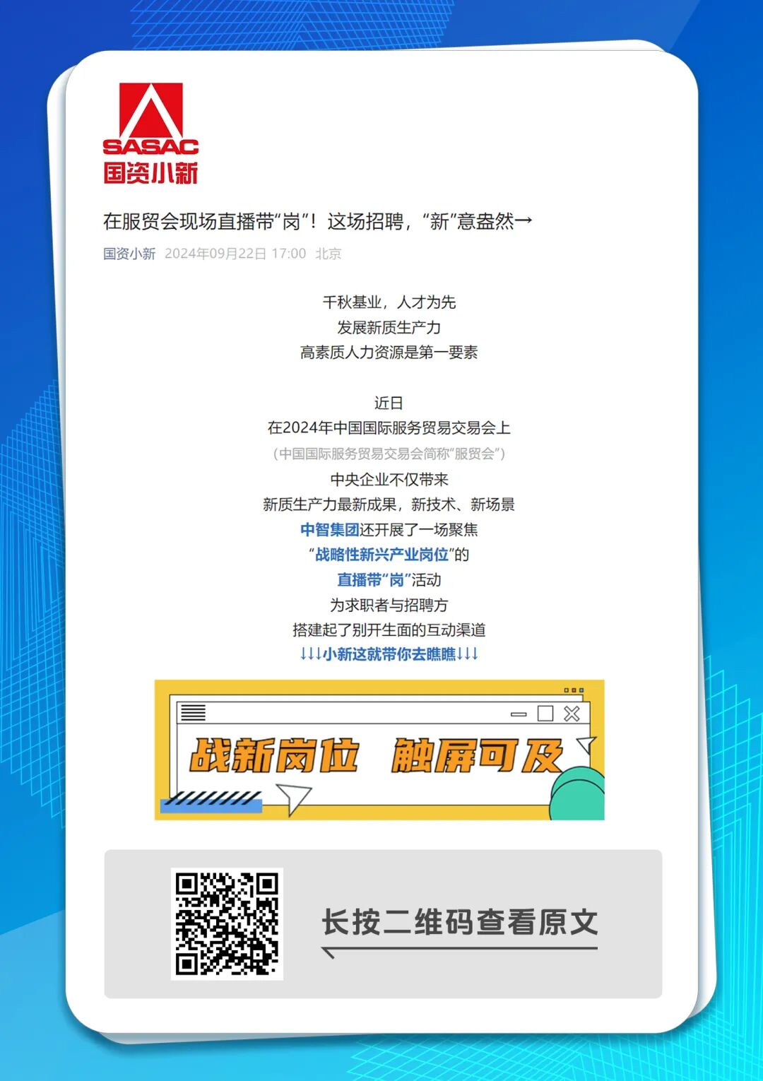 · 國務(wù)院國資委網(wǎng)站發(fā)布 | 14家央國企、百余招聘崗位、500+就業(yè)機會,中智集團直播帶“崗” 為服貿(mào)會注入新動力