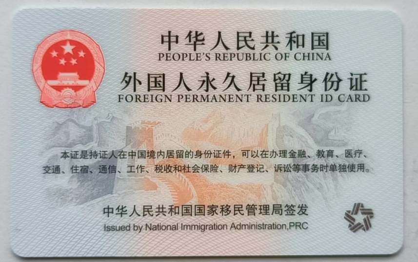 The "PR Card" (i.e. the Five Star Card) is a valid ID certificate for a foreigner who has obtained permanent residence status in China and may be used independently. Foreigners who have obtained permanent residence card in China may enter and leave China with valid passport and the "PR Card".
