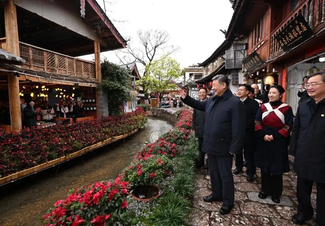 這是19日下午,習(xí)近平在麗江古城考察時(shí),與居民、游客互動交流。新華社記者 謝環(huán)馳 攝
